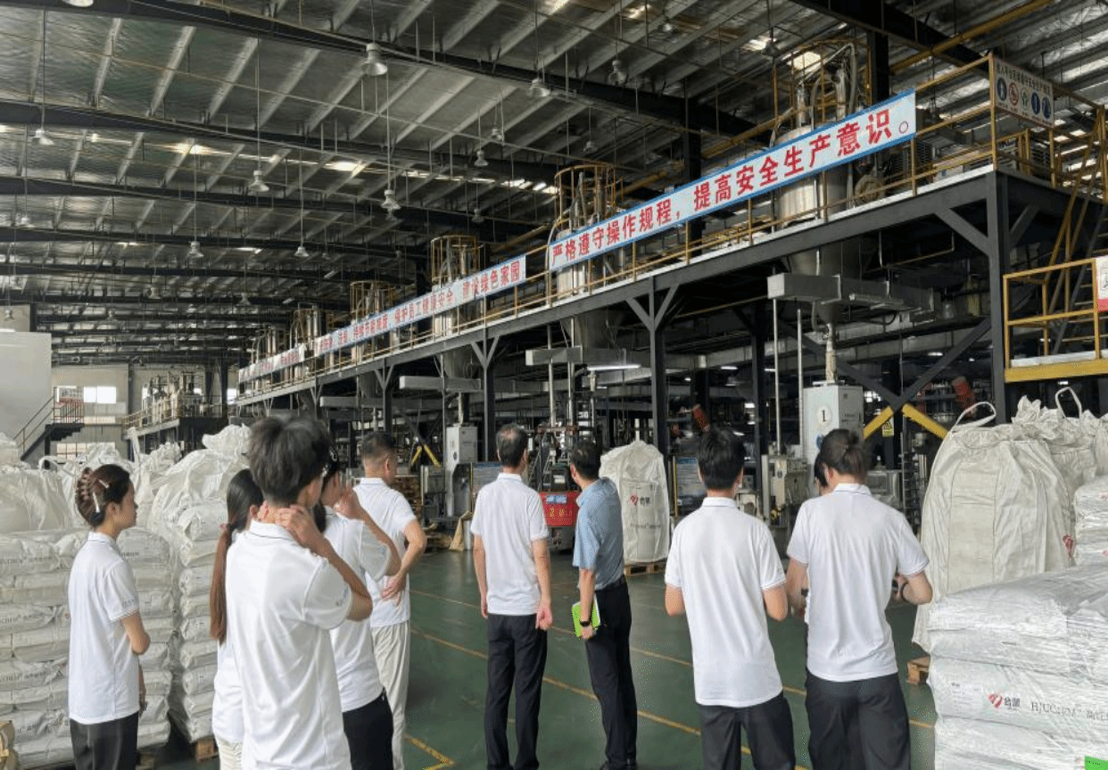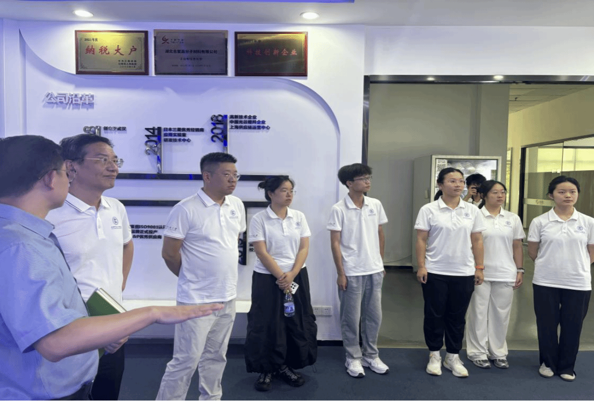 在企业实践环节,团队深入湖北江陵合聚高分子材料有限公司生产一线。在技术人员的带领下,队员们参观了从原料聚合到成品出厂的全流程生产线。“课本上的螺杆转速、熔体温度参数,在这里要精确到小数点后两位!”在生产车间里,李陵洲校友向同学们详细讲解着智能化生产线的运行逻辑。尽管车间内温度高达40°,但同学们的热情丝毫不减,他们聚精会神地观察着控制屏上的实时数据,近距离感受高分子材料从原料到成品的完整加工流程。“现代生产车间和想象中的完全不同,智能化程度远超预期。”队员王勇在参观后感慨。企业还展示了其最新研发的高分子性能材料,让队员们大开眼界。