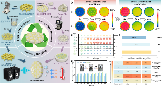 图6展示了该材料的闭环可回收性能。通过“分离-解离-再制造”工艺,材料经过1次和3次回收循环(分别记为R1、R3)后,仍保持优异的综合性能:R1样品的压缩强度为110 MPa,热导率为0.064 W·m⁻¹·K⁻¹,降噪后声压级为70.9 dB;R3样品对应性能分别为103 MPa、0.0671 W·m⁻¹·K⁻¹和71.1 dB。尽管循环后性能略有下降,但仍显著优于商用蜂窝及泡沫材料。该结果证实了材料具有良好的结构可逆性与循环稳定性,为发展可持续的高性能结构材料提供了新方法。