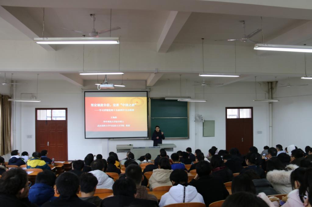 王海燕以“坚定制度自信,完善中国之治”为题,从“充分认识四中全会的重大成果和重大意义”、“深刻领会制度优势,坚定制度自信”、“准确把握重大部署,增强制度自信”、“全面落实各项任务,完善中国之治”等四个方面,深入阐释了党的十九届四中全会的重大意义,深刻阐述了中国特色社会主义制度的国家治理体系的显著优势,通过独到的见解、鲜活的语言、详实的案例,深入浅出地对党的十九届四中全会精神进行了解读。