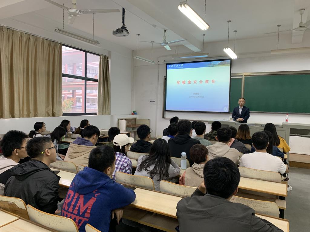 罗锦银向同学们就《2018年高等学校实验室安全检查项目表》的条款分级及检查结果分级方案进行了解读;并简要介绍了当前高等学校实验室安全情况;传达了有关全国高校实验室安全管理工作会议精神和湖北省高校实验室安全管理工作会议精神。