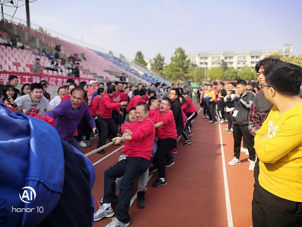 和化工学院教职工拔河比赛把本次趣味运动会推向了第一个高潮。同学们的欢呼声、教师运动员的呐喊声回荡在阳光校区体育场。