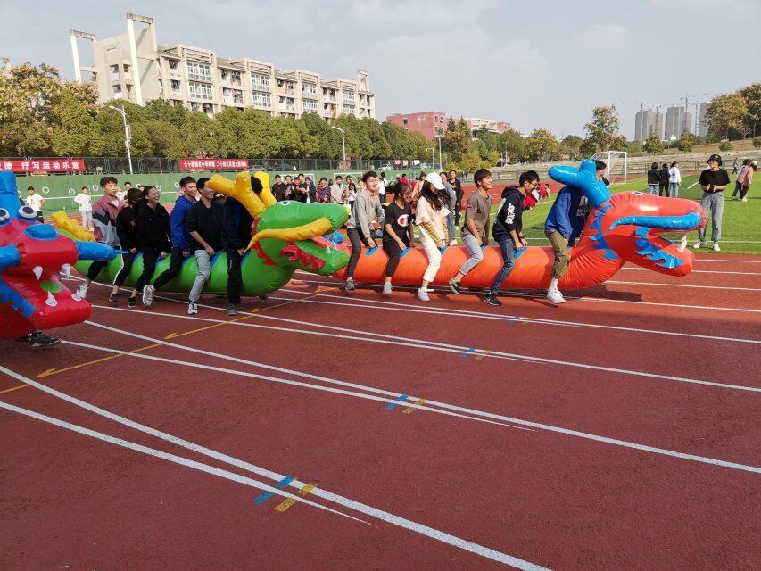 趣味运动会包括九个项目,有抬球作战、 陆地龙舟、三人四足、Photograph、袋鼠跳、心心相印、跳大绳、龟兔赛跑、新铁人三项等比拼的项目。运动场上师生相互鼓励、团结协作;场外观众摇旗呐喊、鼓掌助威,整个会场气氛热烈,充满了欢声笑语。