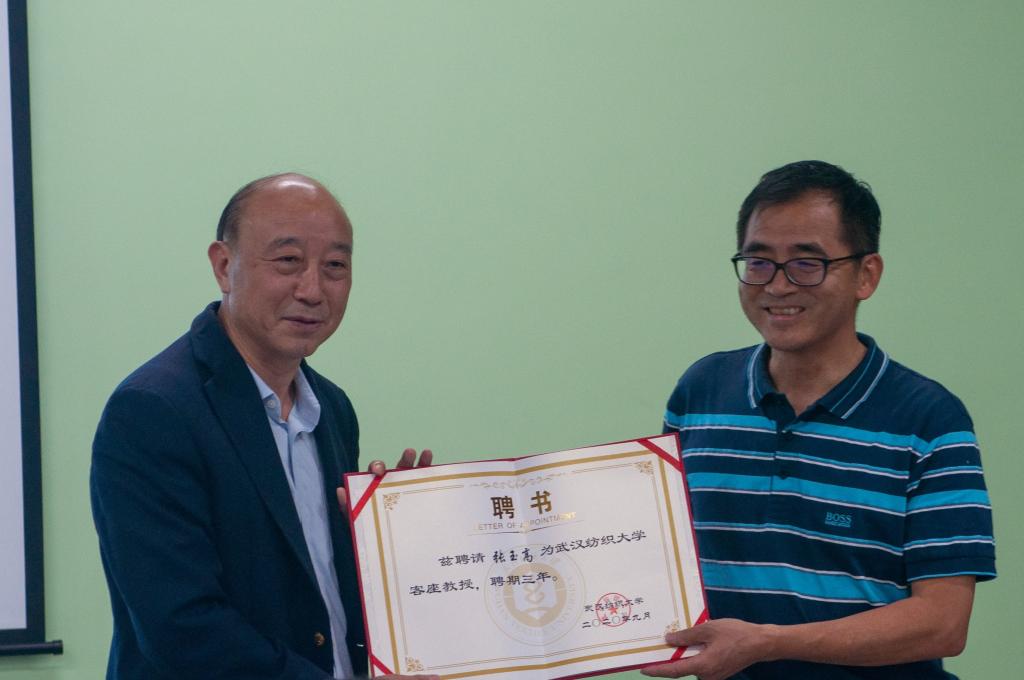 校党委常委、副校长姜明华教授致辞。他对远道而来的溢达集团各位领导表示热烈的欢迎和诚挚的问候,对长期以来关心支持学校事业发展的溢达集团表示衷心地感谢,对各位评委表示由衷的感谢。他表示今年是中国共产主义青年团成立百年,也是党的二十大召开之年,希望同学们不懈努力,勇于创新,鼓励学生们为社会进步做出贡献。随后,他为溢达集团首席科学家&集团研发总监张玉高先生颁发了客座教授聘书。张玉高先生对校方表示感谢,希望能与学校继续加深合作,不断创新合作模式,共同为促进校企才培养做出努力。