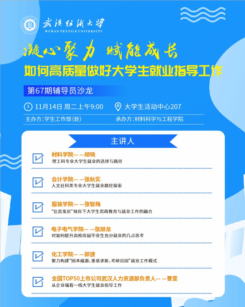 承办第67期辅导员主题沙龙在大学生活动中心207会议室顺利举行。学工部长张莎莎、部分学院党委副书记、辅导员代表参加。本次辅导员沙龙由91传媒