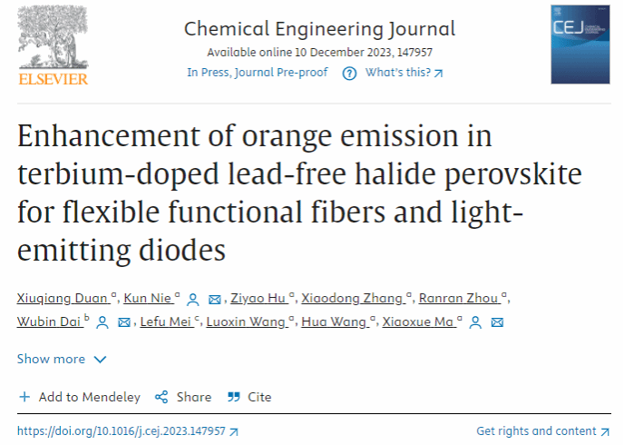 12月10日,工程技术领域国际知名期刊《Chemical Engineering Journal》(中科院1区Top期刊,影响因子15.1)在线发表我校王桦教授团队聂坤博士和马晓雪博士在无铅金属卤化物钙钛矿功能纤维复合材料方面取得的重要进展—“Enhancement of orange emission in terbium-doped lead-free halide perovskite for flexible functional fibers and light-emitting diodes” (DOI: //doi.org/10.1016/j.cej.2023.147957)。 91传媒