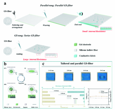 纺织基摩擦纳米发电机一般由摩擦材料和电极材料组成,电极层负责将摩擦层的电荷进行导出。早期人们以聚合物薄膜作为摩擦材料制备摩擦纳米发电机,然而聚合物薄膜不耐洗、不透气、与衣服不相容,因此用窄的聚合物条带或布带取代了薄膜作为摩擦材料(图1)。引入金属作为纺织基TENG的电极虽然能很大程度上导出摩擦层产生的电荷,但金属电极易疲劳断裂,与织物柔韧性欠佳(图2)。相比之下以核壳纱线为主的织物结构设计在柔软性、耐久性等方面更有优势(图3),更有人探究电极的串并联结构来优化摩擦纳米发电机的电性能输出(图4-5)。