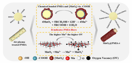 图1.芳纶表面羟基和羧基对纶负载MnO2催化剂表面MnO2比表面积、氧空位、耐洗涤特性的协同调控机制
