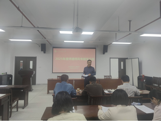 依据学校统一部署,结合学院实际,于 317 会议室组织开展了 2025 年度师德师风建设月专题活动。此次活动由学院党委书记王罗新主持,全体教师积极参与,为学院教育教学高质量发展注入强大动力。