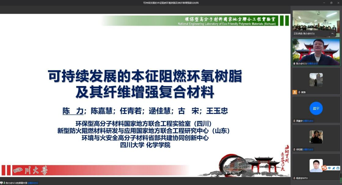 陈力教授首先介绍了四川大学的人文环境、团队的研究方向;随后,陈教授介绍了近年来基于动态化学作用的可重塑本征阻燃环氧树脂及其复合材料相关工作成果,着重报道了几种基于动态酯交换作用(包括外加催化剂和自催化体系)和混合酯交换作用的本征阻燃环氧类玻璃体及其碳纤维复合材料的设计制备。