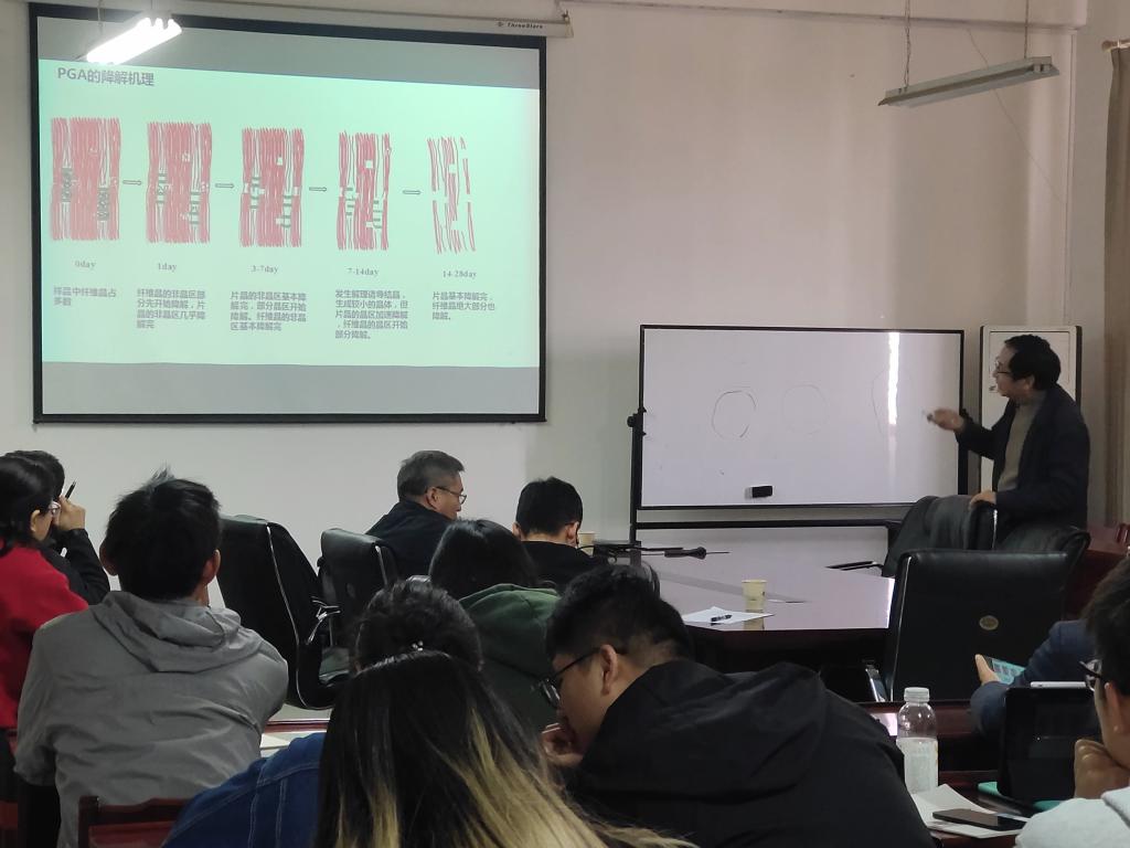 “阳光学术论坛”系列活动。本次邀请中国纺织科学研究院有限公司研究员,博士生导师黄庆教授于4月7日上午11:00于8F506会议室进行学术报告,刘欣教授担任主持人,研究生代表及各位老师也一同参加了此次报告。