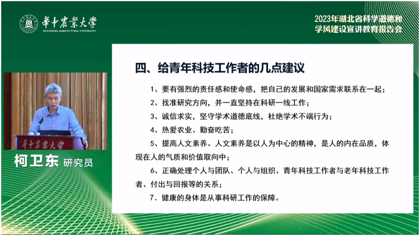 报告会由省科协、省委军民融合办、省教育厅、省科技厅、省社科院、中国科学院武汉分院主办,华中农业大学承办,旨在弘扬科学家精神,涵养优良作风学风,增强恪守科研诚信和科技伦理规范的思想自觉、行动自觉,共同营造风清气正的学术生态。