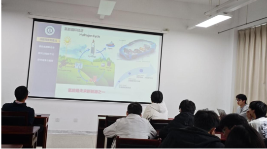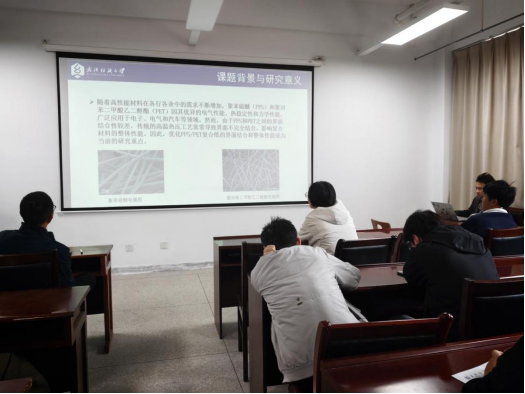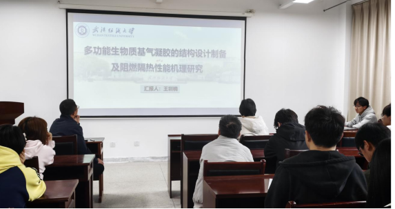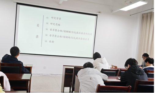 承办,杨晨光、李晨两位老师担任指导评委。学院硕士研究生徐琦、王圳楠、王伟豪、龚昀泽四位同学围绕绿色功能材料、新能源催化、复合纸基材料等前沿方向,依次汇报最新科研进展,集中展示学院在氢能催化、生物质气凝胶、生物基疏水涂层及高性能复合纸领域的创新探索与应用成果。
