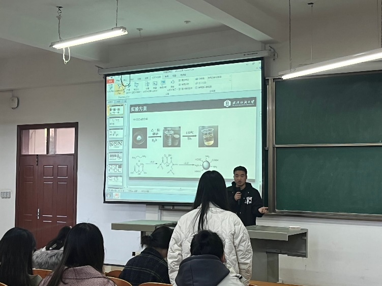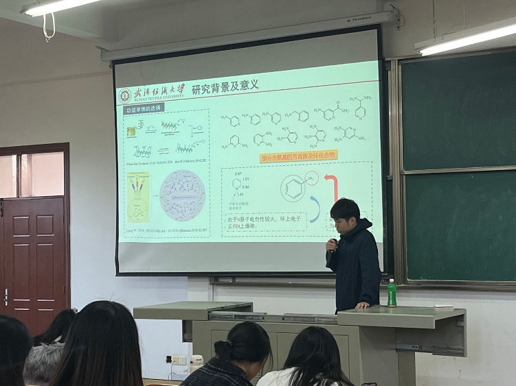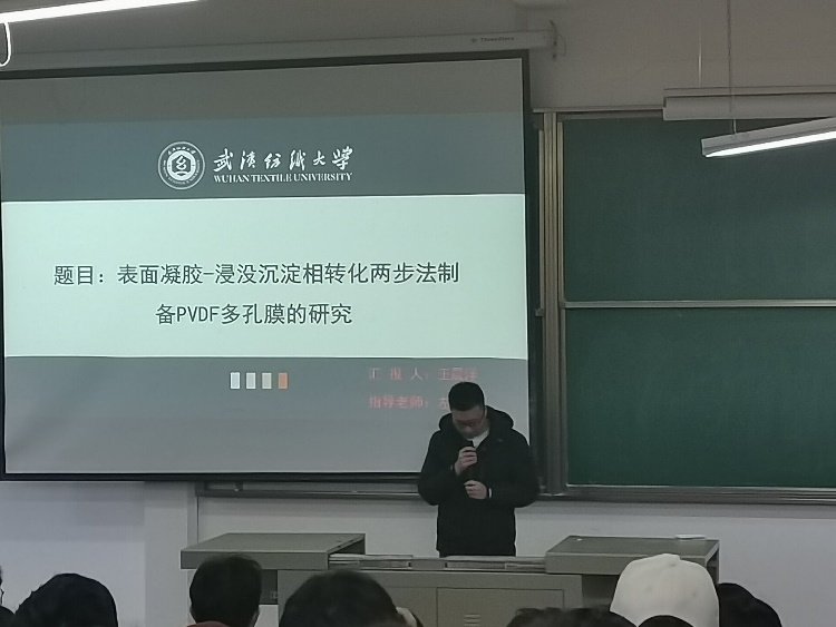 黄智宇、陈童、王晨洋三位同学分别给学院全体研究生以“芳香杂环化合物修饰棉纤维的制备及吸附性能研究”、“掺氮碳量子点功能化聚(N-异丙基丙烯酰胺)的多重刺激响应性”和“表面凝胶-浸没沉淀相转化两步法制备PVDF多孔膜的研究”为主题的三场专题报告。