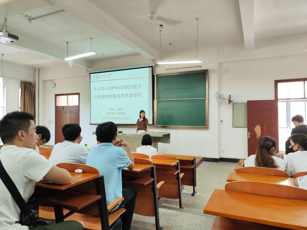 李星、钟佳锦、张博文三位同学分别给学院全体研究生作以“离心纺制备聚酰亚胺纤维纸及其绝缘性能研究”、“ZrO2/Si-C-O多相柔性陶瓷纳米纤维的制备和性能研究”和“干法离心纺PVA/CMCS复合纤维膜的制备及其性能研究”为主题的三场报告。