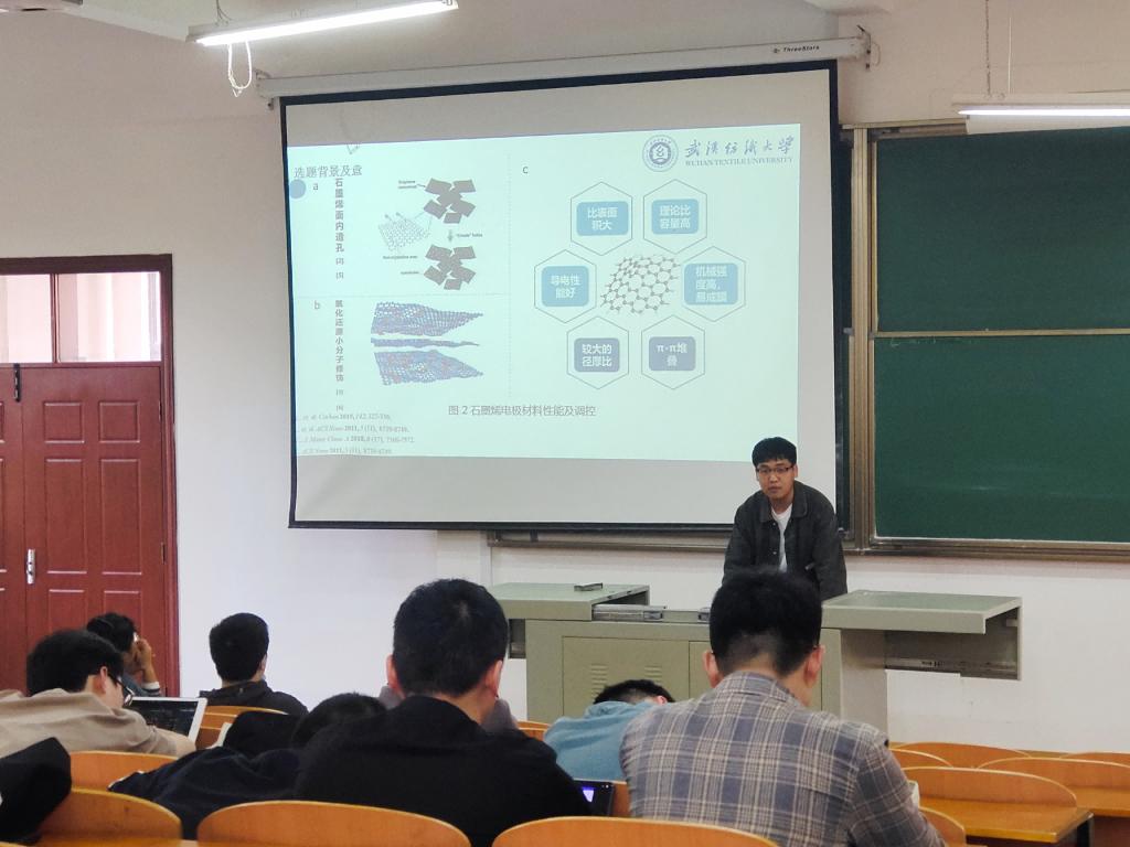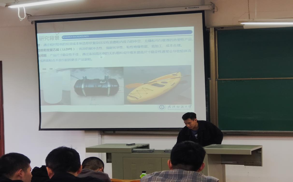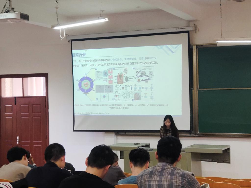 李丹鼎、郭超、张佳贝三位同学分别给学院全体研究生作以“改善滚塑用线性低密度聚乙烯的尺寸稳定性、机械性能和加工性能之间的平衡”、“对苯二胺功能化石墨烯研究及其在超级电容器中的应用”和“用于伤口敷料的壳聚糖/纳米银改性羧甲基粘胶纤维的制备及其抗菌性能”为主题的三场专题报告。