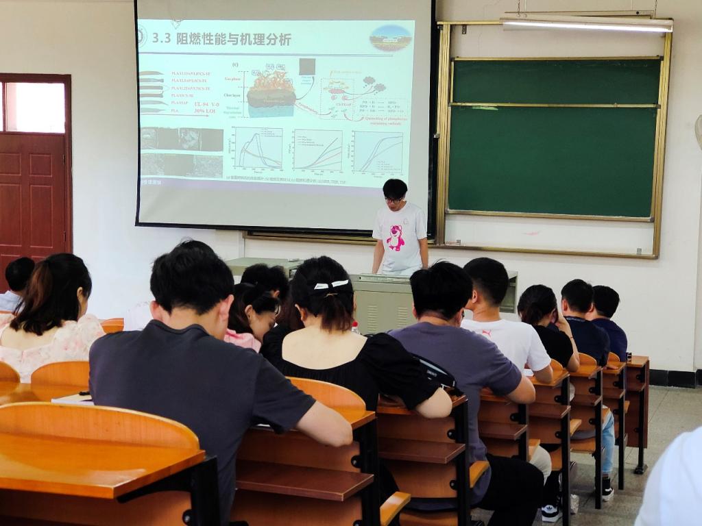 汪亚东以壳聚糖/次磷酸铝实现无熔滴高效阻燃聚乳酸为题,从其制备材料阻燃性能与机理等方面展开分析,引发在场同学们的深入思考,并激发了在场老师及同学们的热烈讨论。