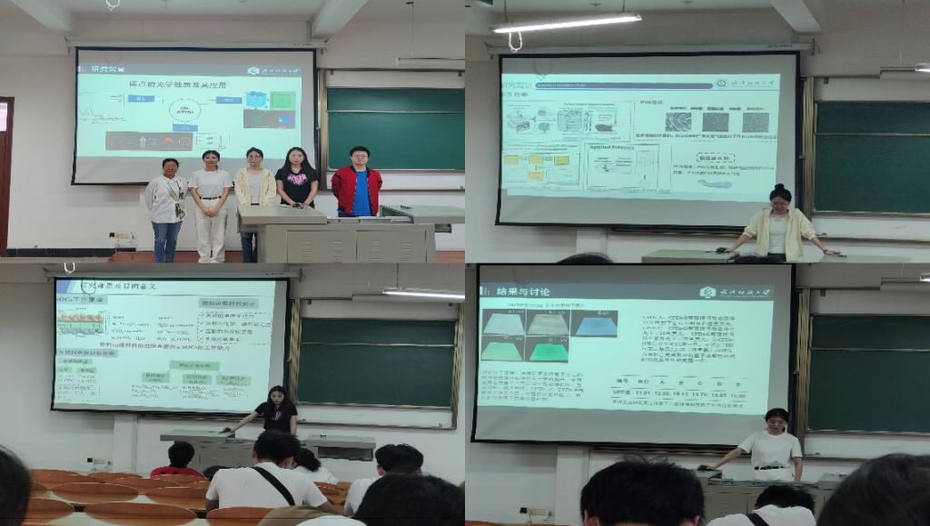 然后,冯亿林汇报了“抗压型SiO2气凝胶粒子的制备及用于多孔纤维的超轻质填充性能的研究”,着重介绍了PVA作为致孔剂的机理。肖梦琴汇报了“固体氧化物电池锶铁钼氧基双钙钛矿燃料电极材料的研究改性”,详细证明了其作为燃料电极的可行性。最后,孙硕汇报了“三色发光参杂碳量子点的制备及其应用探究”,着重介绍了CQDs的发光特性。