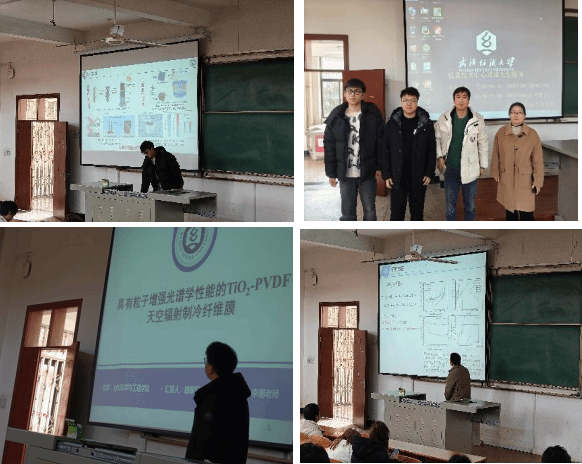 首先,郝嘉嘉介绍了他的研究成果,题为“Pickering乳液模板法制备的圆柱状开孔气凝胶用于高效太阳能驱动水蒸气”。这项研究分享了通过pickering乳液模板法自招一种新颖优异的气凝胶,并强调其在提高光热效率的重要作用。接下来,魏黎民详细介绍了他的研究题目:“具有粒子增强光谱学性能的TiO2-PVDF天空辐射制冷纤维膜”,分享了一种性能高效的天空辐射制冷纤维膜并对其能增强粒子光谱进行研究。最后,余敏报告了“多孔sp2碳基复合材料在柔性超级电容器中制备与研究”,他深入探讨了多孔sp2碳基复合材料在超级电容器方面的应用并对其优异性进行研究。
