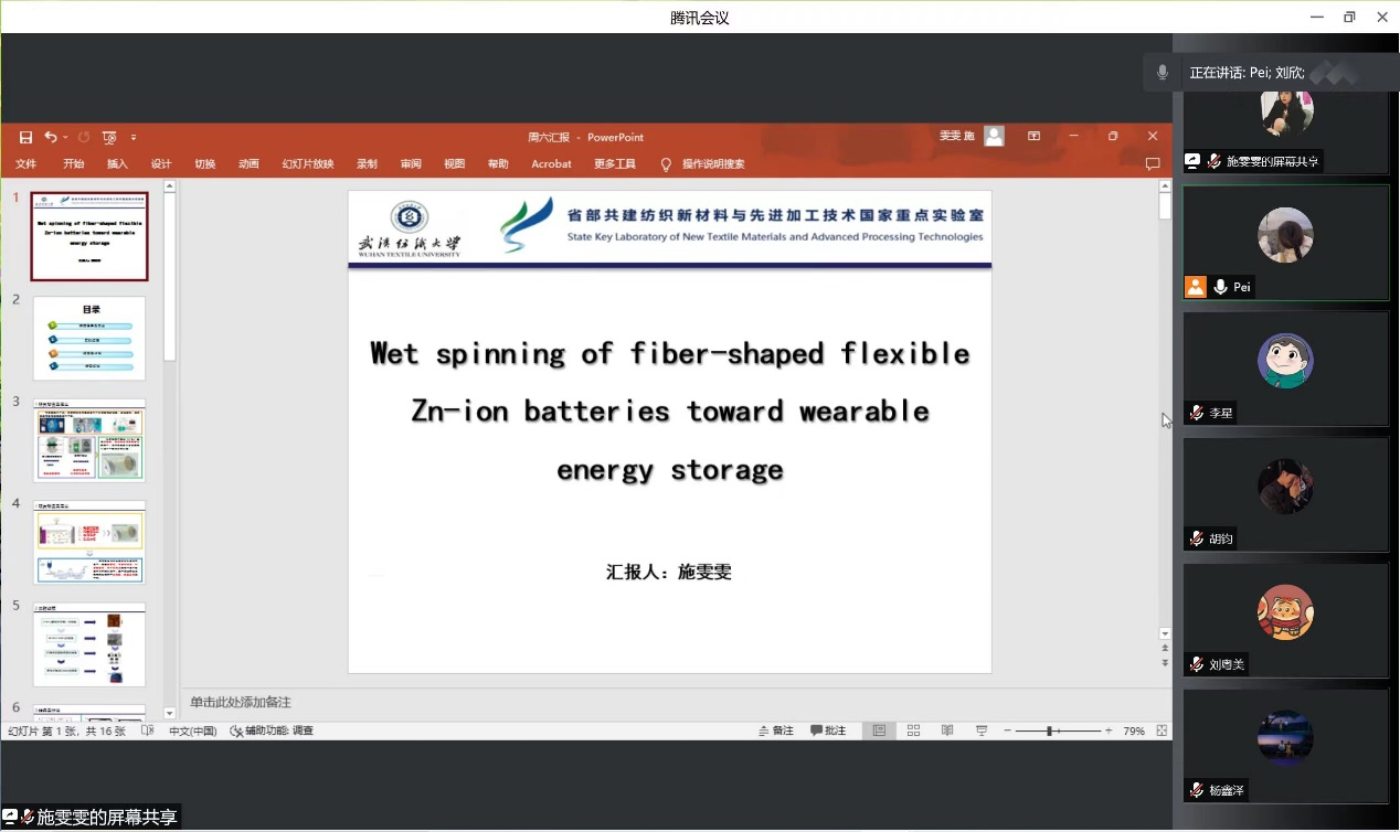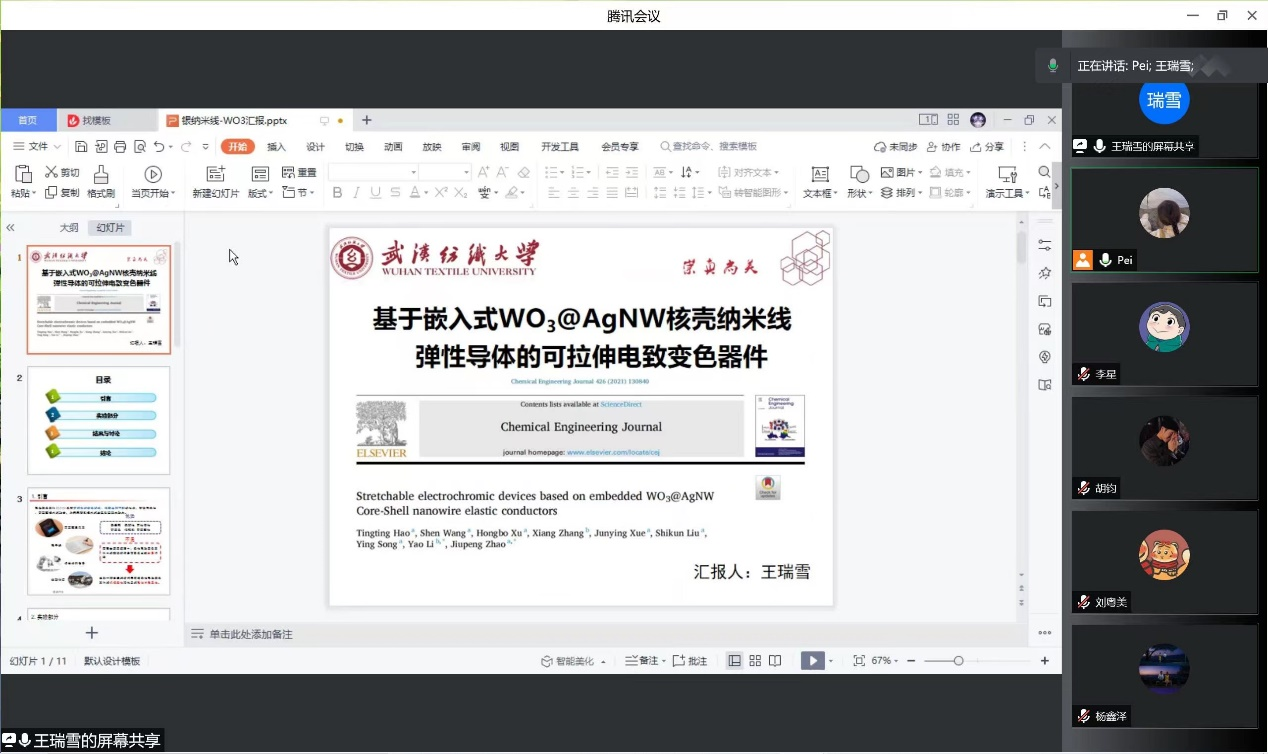 会议上,研究生一年级学生汇报了课题组相关的文献内容,介绍了相关文献的难点与创新部分,主讲同学的研究课题涵盖了可拉伸电致变色器件、湿法纺丝技术、碳纤维/聚氨酯导电膜领域。老师首先针对文献的实验部分进行解答,并针对汇报存在的问题提出了要求及修改意见。文献的检索和阅读对研究生的日常学习十分重要,老师们鼓励大家,熟悉专业词汇,博闻强识,定能有所收获。学术没有捷径可走,要大量阅读中英文文献,有足够的积累才能了解学术界的研究进展。在读懂文献的基础上,更要理解作者的科研思路,有何突破,有何不足,在此基础上,积极探索技术方法,大胆假设,小心验证。同时,要注意学习英文写作方式和表达方法,活学活用,触类旁通,在自己的英文论文撰写中加以运用。会上其他同学纷纷提出问题和建议,进行头脑风暴,营造了“赶超比拼”的良性互动氛围。