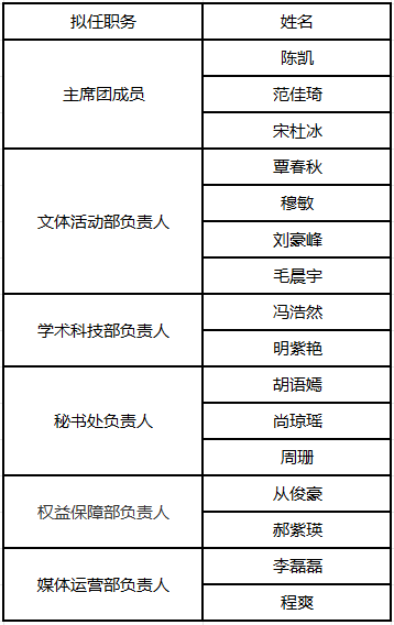 学生会第十五届主要学生干部及部门负责人预备人选名单予以公示:(排名不分先后)