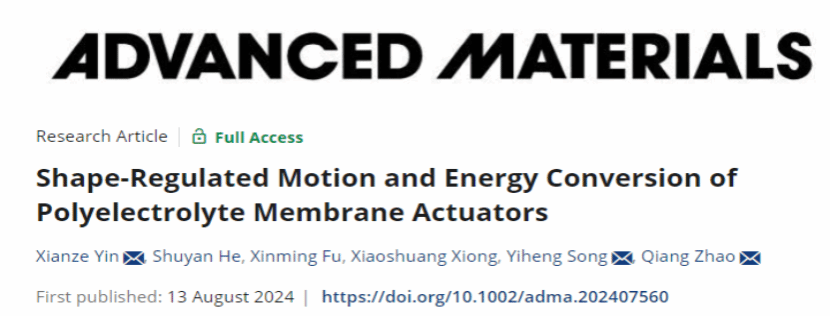 殷先泽教授团队在材料类国际知名期刊《Advanced Materials》发表了题为“Shape-regulated Motion and Energy Conversion of Polyelectrolyte Membrane Actuators”的最新研究成果。91传媒