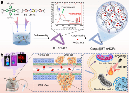 此项研究首次通过四(4-氨基二联苯)甲烷(Tetrakis(4-amidiniumphenyl)methane, TAM)与盐化后的4,4'-(苯并[1,2-d:4,5-d']双(噻唑)-2,6-二基)二苯甲酸(4,4'-(benzo[1,2-d:4,5-d']bis(thiazole)-2,6-diyl)dibenzoic acid, BBTDB)分子在温和的水溶液中自组装,制备了一种新型的纳米级HOFs(BT-nHOFs)。BBTDB分子是通过点击缩合反应高效合成,其具有良好的π-共轭平面结构,不溶于各种溶剂(例如N,N-二甲基甲酰胺、二甲亚砜、甲醇、乙醇、水等),极大地限制了后续的生物医学应用研究。因此,将BBTDB分子进行盐化处理,使其具有良好的水溶性。BBTDB分子在808 nm激光照射下表现出了优异的光热特性,制备的BT-nHOFs不仅保持了良好的光热性能和光稳定性,而且使光热转换效率显著增高到51.4%± 3.6%。体内外实验表明,BT-nHOFs具有良好的生物相容性和降解性,可以靶向热敏感的线粒体,在肿瘤部位有效富集,从而通过PTT实现实体肿瘤组织的有效消融。此外,BT-nHOFs的三维多孔结构,可高效封装荧光染料,用于多模态成像引导的肿瘤精准治疗。本研究为难溶的光活性小分子在生物医学领域应用提供了新思路,为HOFs材料在临床应用中的研究奠定了基础。