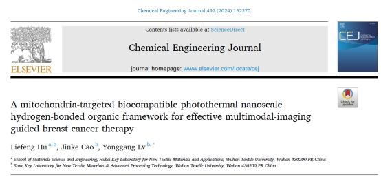 青年教师胡烈锋博士在国际知名学术期刊《Chemical Engineering Journal》(中科院1区Top期刊,影响因子15.1)在线发表了题为“A mitochondria-targeted biocompatible photothermal nanoscale hydrogen-bonded organic framework for effective multimodal-imaging guided breast cancer therapy”的论文(链接://www.sciencedirect.com/science/article/pii/S1385894724037574?via%3Dihub)。91传媒