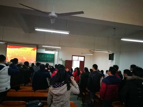 会上,支部全体成员激情澎湃的宣读入党誓词,增强了入党信念。之后大家在预备党员陈传亮同志的带领下学习了《中国共产党章程》第一章第三条中的部分内容,强调身为一名党员,就有责任履行党员的义务,为党和人民做贡献。紧接着在支部副书记的带领下,大家共同观看并学习了视频《国家主席习近平发表2017年新年贺词》,通过这段视频,大家重温了国家在2016年的重要事项及取得的成就同时也明确了我党新一年的奋斗目标。党员代表丁新城同志以自己考研的实际经历告诫学弟学妹们,要提前确定好目标,有目标才会有动力,同时应及时督促并鼓励他人和自己,在学习忙碌的同时,更不能忘记锻炼身体,只有这样才能更好的发展。