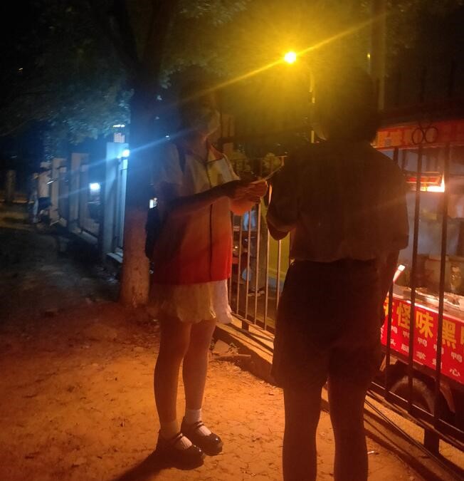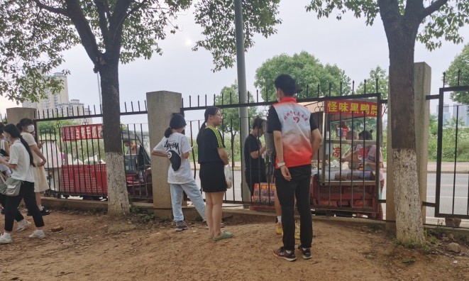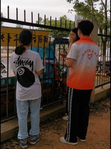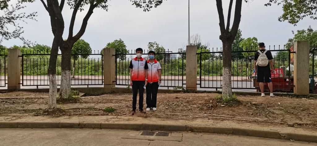 毕业生党员积极报名参加校园疫情防控巡逻志愿服务活动,提醒正在校园围栏处购物的同学们戴好口罩、做好个人防护。