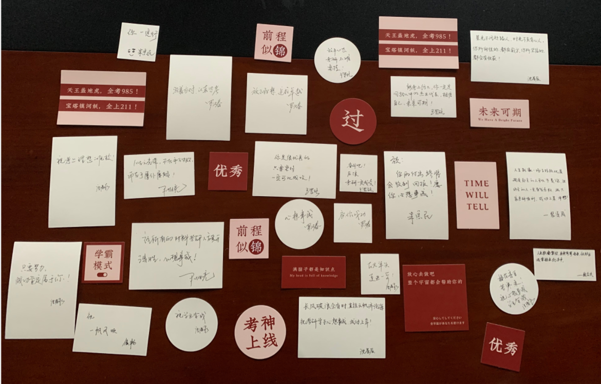 的老师,可能来自于低年级的学弟学妹,也可能来自于研究生学长学姐。学院党委书记罗汉春写道“放飞理想、追求卓越”“心想事成”,学院院长王罗新写道“能考上纺大,你一定是同龄人中的杰出代表,相信自己,未来可期”“你是很优秀的,只要坚持一定可以成功”。马绪亮老师写道“祝所有材料考研人旗开得胜、心想事成”。唐清泉老师写道“只要努力,成功定属于你”。