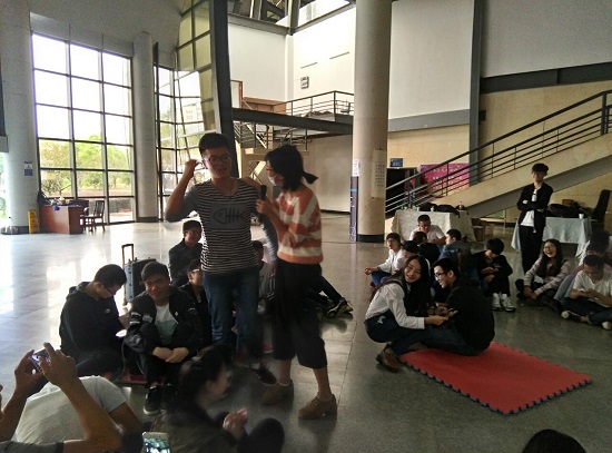 齐眉竿游戏环节中,将齐眉杆放在一队同学们的指尖上,队员们要保证齐眉竿水平的上下移动,一旦指尖离开齐眉杆或者杆没有水平移动,则任务失败。“我发现当团队要完成同一目标时,需要齐心协力,共同摸索最有效的途径才能成功。”侯帅说道。