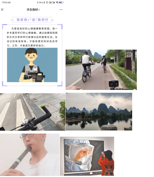 积极响应学校“我爱我+‘疫’路同行”短视频大赛号召,于学院内举办“共抗疫情,健康同行”短视频比赛,通过拍摄短视频的方式分享同学们疫情过后的居家生活。生活过的有滋有味,感受疫情中不同灵魂的体悟与成长,才能有更好的状态去学习,工作,才能成为更好的自己。