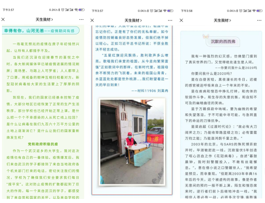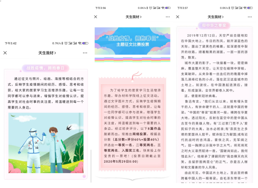 举办“战胜疫情,拥抱春日”主题征文活动,通过征文与照片、绘画、海报等相结合的方式,反映学生疫情期间的经历、感悟、思考和收获,给大家的居家学习生活增添乐趣,让每一位同学都可以参与进来,增强学生对疫情认识,提高学生对社会时事的关注度,将温暖送到每一个需要的人身边。