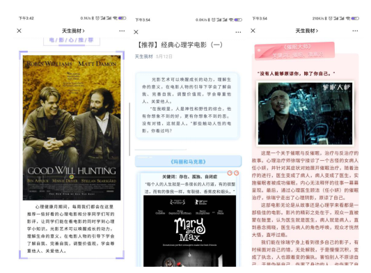 微信公众号“天生我材”推荐心理电影,分享同学们撰写的影评,让同学们能在看电影的同时学到心理学小知识。