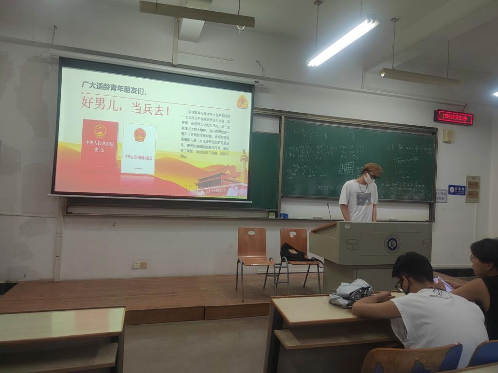 征兵负责人毛成兴老师携学院退役大学生士兵代表晏松、吴军、何其泽以及各班班长等,在晚点名班会时间集中开展了“三个一”征兵宣传活动。