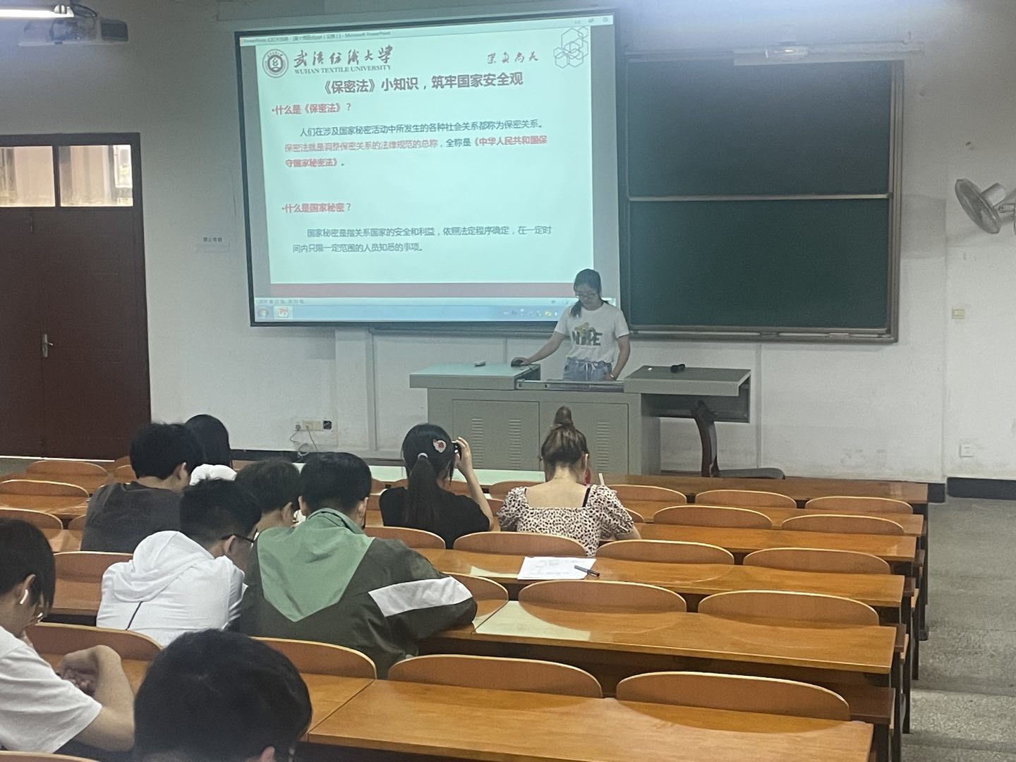 在国家安全方面,组织学生学习了总体国家安全观的“五大要素”——以人民安全为宗旨,以政治安全为根本,以经济安全为基础,以军事、科技、文化、社会安全为保障,以促进国际安全为依托;了解了《保密法》和什么是国家秘密,解释了哪些行为是恐怖活动,面对恐怖活动和邪教大学生可以怎么做,倡导大学生践行总体国家安全观,以新安全格局保障新发展格局。最后,还组织观看了国家安全宣传片《光芒》。