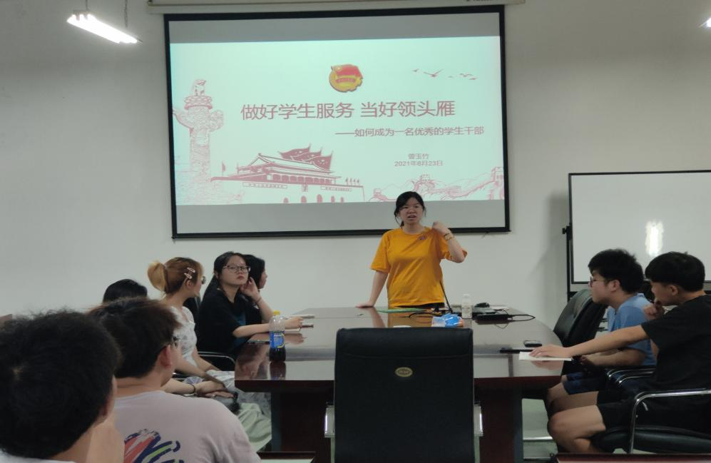 在8F-506会议室召开第二期学生骨干培训会,团委书记曾玉竹老师以“做好学生服务,当好领头雁”为主题,从学生干部工作职责、工作能力及工作要求尽心具体阐释,对全体团委学生会成员进行主题团课宣讲。