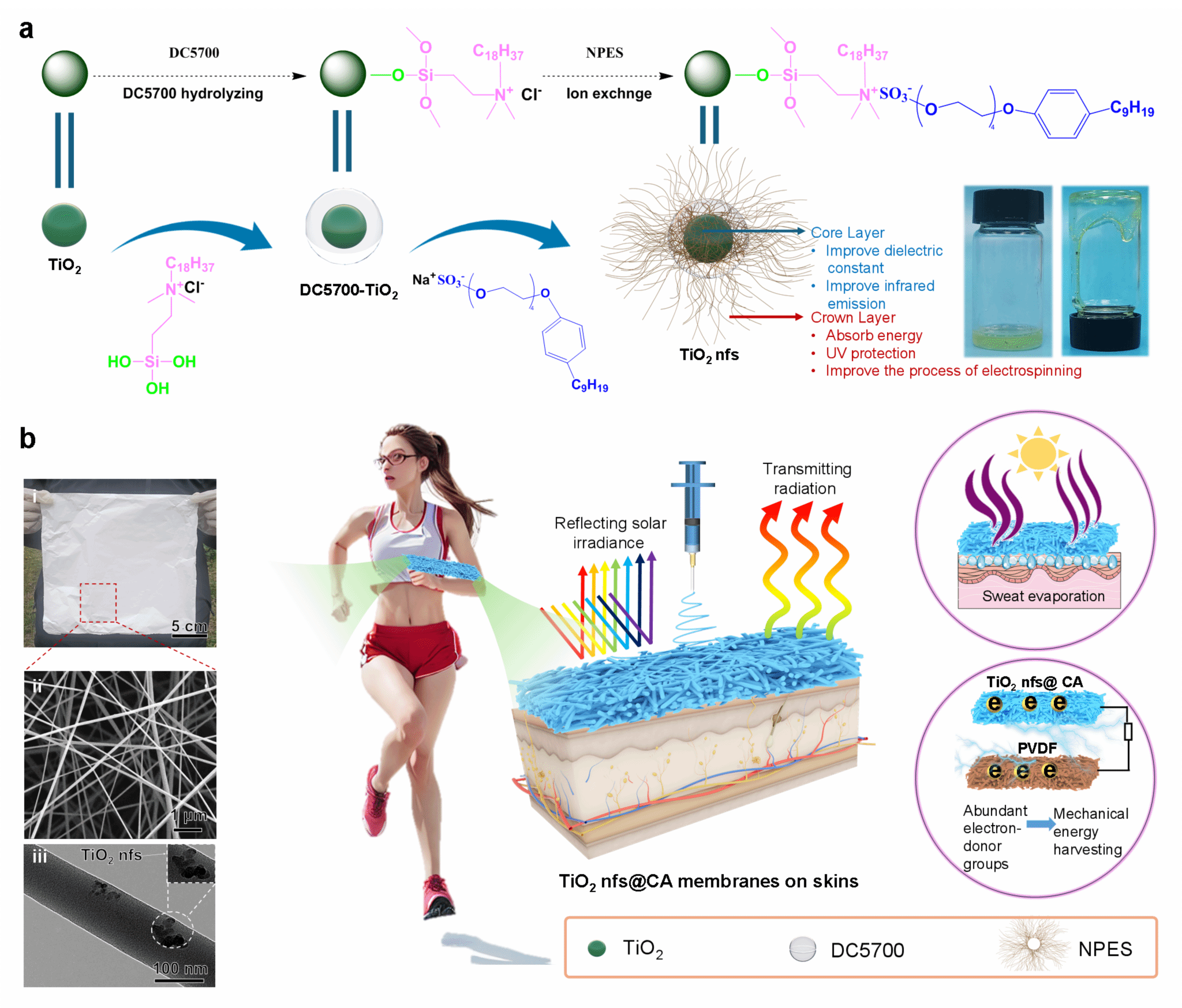 研究生陈之诚、徐梅为共同第一作者。该论文详细分析了二氧化钛无溶剂纳米类流体(TiO2 nfs)在织物型摩擦电纳米发电机(t-TENGs)的应用,报道了二氧化钛无溶剂纳米类流体在人体温范围内迷人的相变吸热特性及其在机电转化中面向生命健康传感的应用(图1)。