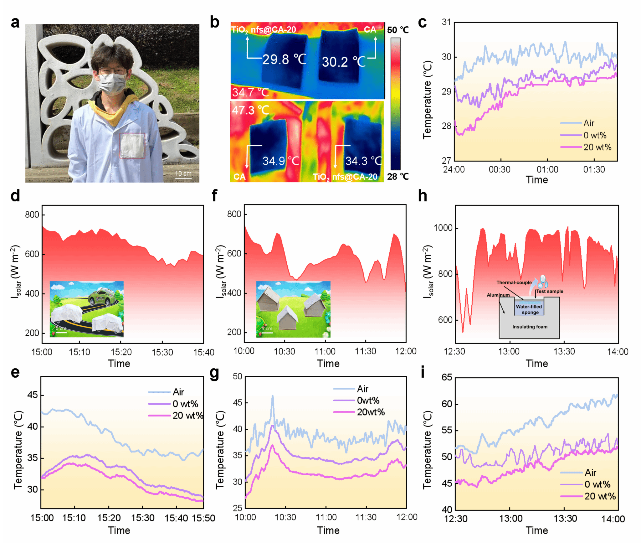 图2 TiO2 nfs@CA纤维膜的辐射冷却应用
